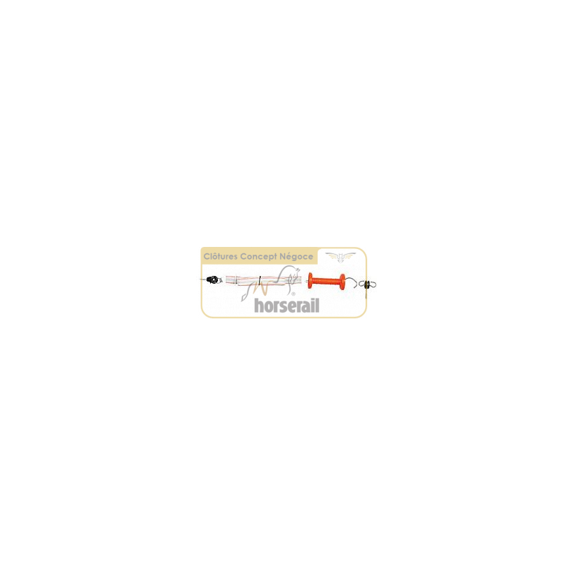 Comprend : 1 poignée, 1 isolateur de poignée, 1 isolateur d'ancrage, 5m00 de ruban 38mm blanc/orange.